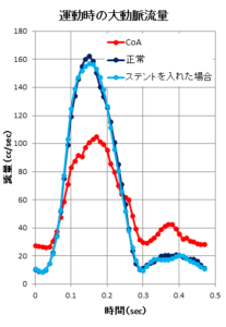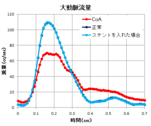 大動脈縮窄症(CoA)の場合と縮窄部にステントを入れた場合と正常の場合における、縮窄部より下部への流量を調べました。